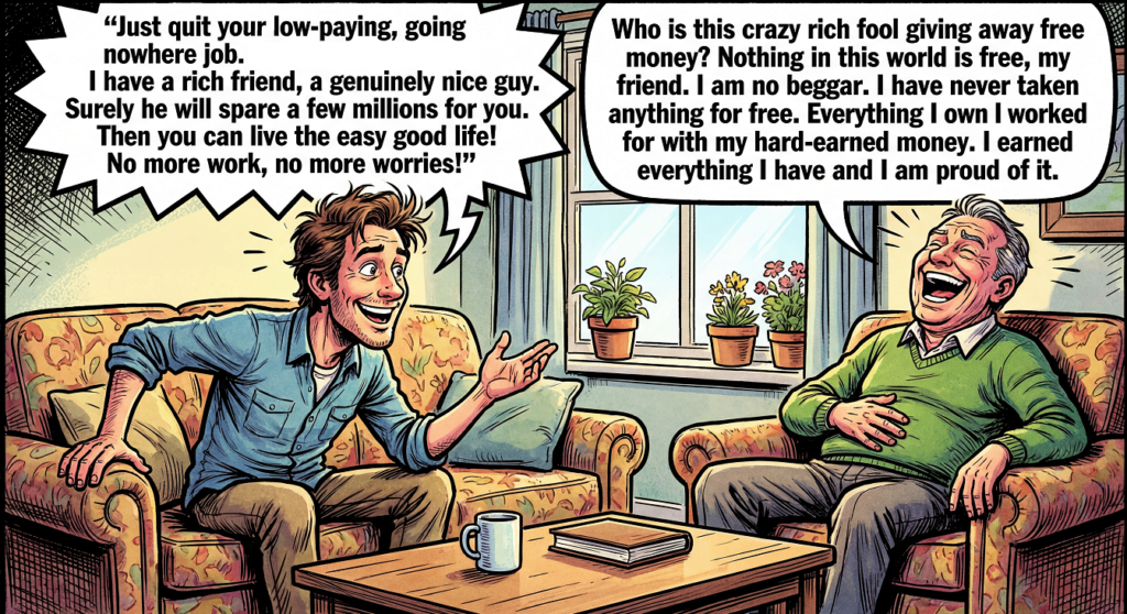 Suppose you are stuck in a low-paying, going nowhere, boring job and someone says to you, “Just Quit! Quit! I have a rich friend, a genuinely nice guy. Surely, he will spare a few millions for you. Then you can live the easy good life! No more work, no more worries!”